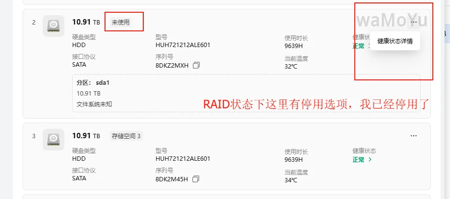 cat /proc/mdstat命令查看状态。root@5825U:~# cat /proc/mdstat Personalities : [raid0] [raid1] [raid4] [raid5] [raid6] [raid10] [linear] md0 : active raid1 sda1[1] sdb1[0] 11718751232 blocks super 1.2 [2/2] [UU] bitmap: 0/88 pages [0KB], 65536KB chunk md1 : active raid1 sdc1[0] 1000071168 blocks super 1.2 [1/1] [U] bitmap: 0/8 pages [0KB], 65536KB chunk md127 : active raid1 nvme0n1p3[0] 909520896 blocks super 1.2 [1/1] [U] bitmap: 3/7 pages [12KB], 65536KB chunk unused devices: <none>在网页端中停用一块硬盘。
