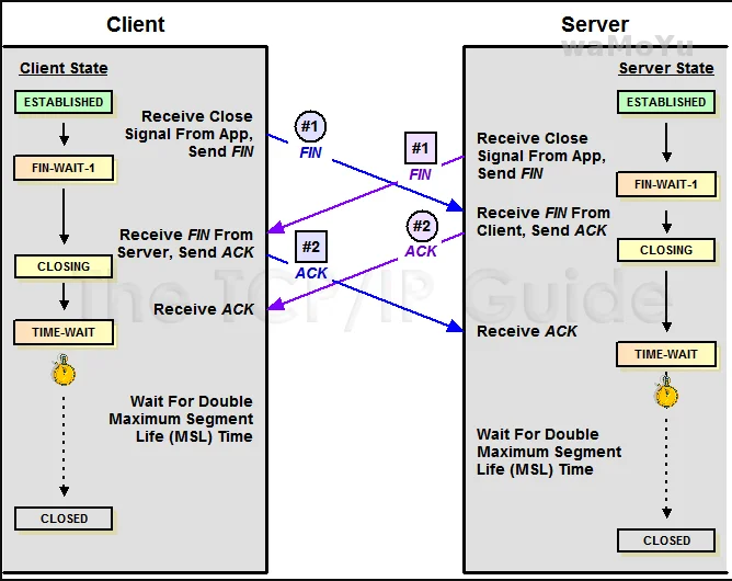 可以看到双方都主动发起断开请求所以各自都是主动发起方,状态会从 FIN_WAIT_1 都进入到 CLOSING 这个过度状态然后再到 TIME_WAIT。