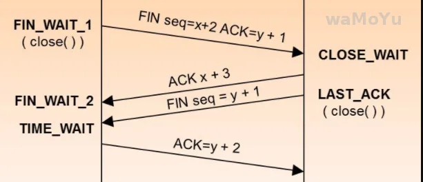为什么挥手需要四次?因为 TCP 是全双工协议,也就是说双方都要关闭,每一方都向对方发送 FIN 和回应 ACK。
